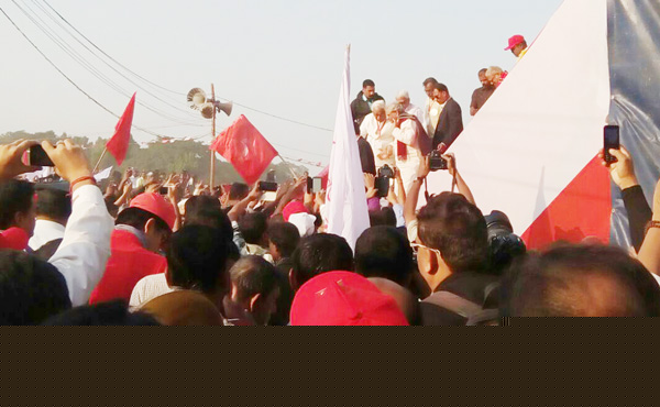 সিপিএমের সাধারণ সম্পাদক সীতারাম ইয়েচুরি জনতার উদ্দেশে প্রশ্ন করেন, তৃণমূল সরকারকে হারানোর চ্যালেঞ্জ তারা নিচ্ছেন কি না? জবাব একটু ক্ষীণ হচ্ছে শুনে তিনি পাল্টা বলেন, “আমার কানেই আওয়াজ পৌঁছচ্ছে না, তো নবান্নে কী ভাবে পৌঁছবে!” এর পরই গর্জন করে ওঠে জনতা। সভার সভাপতির দায়িত্বে ছিলেন প্রাক্তন মুখ্যমন্ত্রী বুদ্ধদেব ভট্টাচার্য। একেবারে শেষলগ্নে সংক্ষিপ্ত ভাষণে তাঁর বক্তব্য, “দেশকে বিজেপি-র হাত থেকে উদ্ধার করতে হবে। রাজ্যটা সর্বনাশের কিনারায় দাঁড়িয়ে আছে। তৃণমূলের হাত থেকে এ রাজ্যকে বাঁচাতে হবে। লড়াই লড়তে হবে তো বটেই, এ লড়াই জিততেও হবে।” সভার শেষে স্লোগানের সূত্রধর হিসাবে সম্পূর্ণ অচেনা ভূমিকায় দেখা গিয়েছে বুদ্ধবাবুকে। মঞ্চ থেকে তিনি নামামাত্রই তাঁকে ছেঁকে ধরে জনতা। বেশ কয়েক জন তরুণ-তরুণী বুদ্ধবাবুকে প্রশ্ন করেন, কেন তাঁকে আরও বেশি করে প্রকাশ্যে দেখা যাচ্ছে না। প্রাক্তন মুখ্যমন্ত্রী তাঁদের বলেন, “আপনারই আমাদের শক্তি। আপনারা লড়াই করছেন, আমরা সঙ্গে আছি।”