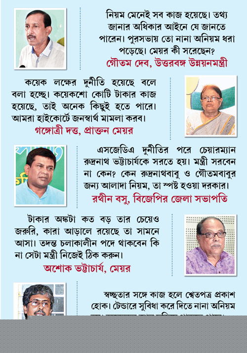 অশোকবাবু বলেন, ‘‘গোটা রাজ্যে প্রথমে অর্থলগ্নি সংস্থার দুর্নীতি সামনে আসে। সেই সঙ্গে এ জেলায় এসজেডিএ, রেশনের পর এবার উত্তরবঙ্গ উন্নয়ন দফতরের দুর্নীতি প্রকাশ্যে আসল। উন্নয়ন মন্ত্রী নিজেই দুর্নীতি হয়েছে স্বীকার করেছেন। এ সব দুর্নীতিকে সামনে রেখেই আমরা মহকুমা পরিষদের প্রচারে নামছি।’’ রাজ্যের প্রাক্তন পুরমন্ত্রী’র দাবি, ‘‘মন্ত্রীর ওই দফতর নিয়ে সঠিক তদন্তের প্রয়োজন। দুই জন নয় ধরা পড়েছে, টাকার অঙ্কটা বড় নয়। কিন্তু এর পিছনে তো আরও কিছু থাকতে পারে। তৃণমূলের আমরা সরকারি দফতরগুলিতে কী হচ্ছে তা আমরা মানুষকে বলব।’’