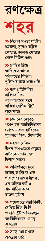 লাঠি চালানোর ঘটনার পরে বামফ্রন্টের তরফে চার জনের প্রতিনিধিদল সন্ধ্যায় লালবাজারের যুগ্ম নগরপাল (সদর) রাজীব মিশ্রের দেখা করে। বামেদের বক্তব্য, পূর্বনির্ধারিত কর্মসূচি অনুযায়ী পুলিশ কমিশনারের কাছে তাদের দাবিপত্র দেওয়ার কথা ছিল। কিন্তু লাঠিচালনার ঘটনার প্রতিবাদে তাঁরা যে আর পুলিশ কমিশনারের সঙ্গে দেখা করতে চান না, সেই কথাই যুগ্ম নগরপালকে জানাতে গিয়েছিলেন তাঁরা। লালবাজার থেকে বেরিয়ে কলকাতা জেলা বামফ্রন্টের আহ্বায়ক নিরঞ্জন চট্টোপাধ্যায় বলেন, ‘‘দু’জায়গায় লাঠিচার্জ হয়েছে। পুলিশ বিনা প্ররোচনায় আমাদের উপরে লাঠি চালিয়েছে। এখানে আলোচনা করতে আসিনি। আলোচনার কোনও জায়গাই নেই!’’ যুগ্ম নগরপাল রাজীব পরে বলেন, ‘‘পুলিশকে লক্ষ্য করে বেন্টিঙ্ক স্ট্রিট, গণেশচন্দ্র অ্যাভিনিউয়ে ইট, ডিম ছোড়া হয়েছে। ফেস্টুনের লাঠি দিয়ে পুলিশকে আঘাত করা হয়েছে। বেশ কিছু পুলিশকর্মী আহত হয়েছেন। তাই পুলিশ পাল্টা ধাওয়া করেছে।’’ পুলিশ-কর্তা এমন দাবি করলেও গণেশ অ্যাভিনিউয়ে অবশ্য দেখা গিয়েছে, বন্ধ দোকানের সামনে ভাঙা টাইল্সের টুকরো তুলে নিতে উদ্যত কিছু বাম কর্মীকে হাত ধরে বাধা দিয়েছেন অন্য বাম কর্মীরাই।