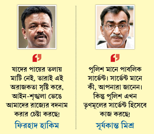শাসক দলের তরফে অবশ্য প্রত্যাশিত ভাবেই অভিযোগ করা হয়েছে, বামেরা শহরে অরাজকতা সৃষ্টি করতে চাইছে। রাজ্যের পুরমন্ত্রী ও তৃণমূল নেতা ফিরহাদ হাকিমের দাবি, ‘‘পুলিশকে আক্রমণ করা হয়েছে। আহত হয়ে চার পুলিশ এসএসকেএমে ভর্তি। আত্মরক্ষার অধিকার সবার আছে!’’ তাঁর কটাক্ষ, ‘‘যাদের পায়ের তলায় মাটি নেই, তারাই এই অরাজকতা সৃষ্টি করে এবং আইন-শৃঙ্খলা ভেঙে আমাদের রাজ্যের বদনাম করার চেষ্টা করছে!’’ পুরমন্ত্রীর দেওয়া তালিকা অনুযায়ী, চার জন পুলিশ দেবল কুমার দাস, তারিণী কুমার রায়, রাজকৃষ্ণ শাহ ও গৌতম হালদার এসএসকেএমের উডবার্ন ওয়ার্ডে ভর্তি। দুই মহিলা পুলিশ দোলা বিশ্বাস এবং নমিতা সরকারও আহত।