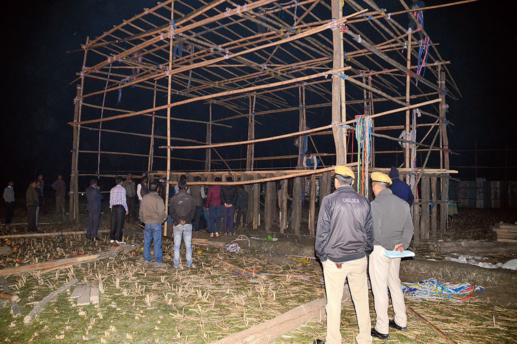 প্রহরা: ময়নাগুড়ির চূড়াভাণ্ডারে প্রধানমন্ত্রী নরেন্দ্র মোদীর সভার মঞ্চ বাঁধা চলছে। প্রহরায় পুলিশ। মঙ্গলবার রাতে। ছবি: দীপঙ্কর ঘটক।
