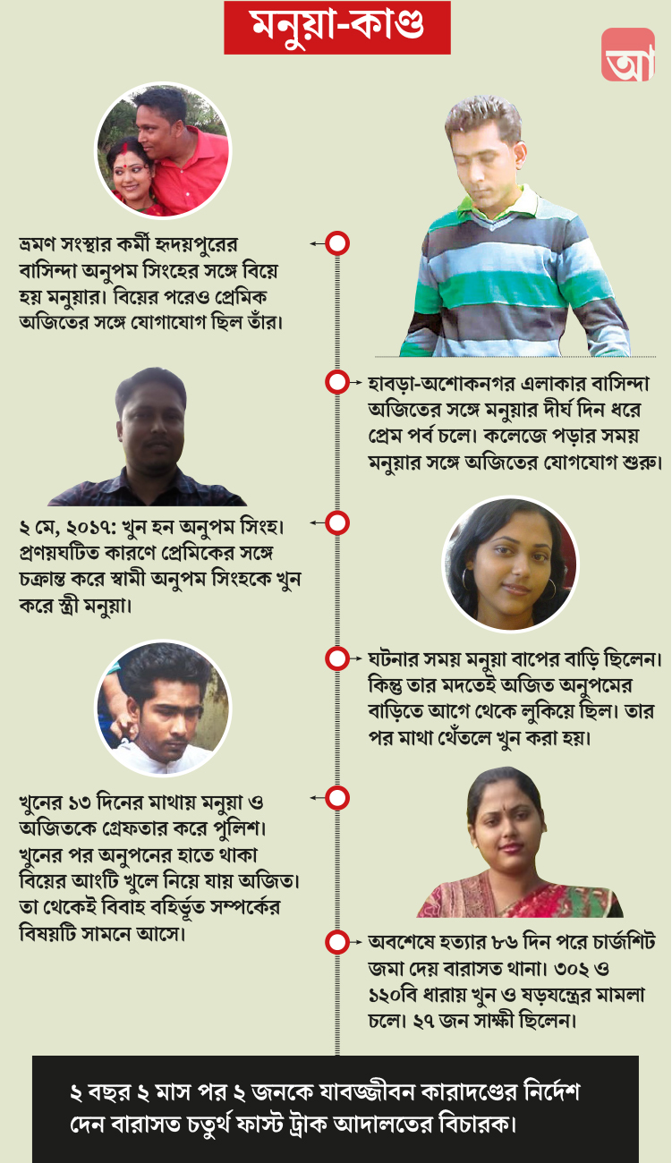 আদালতে দাখিল করা চার্জশিটে পুলিশ জানায়, অজিতের সঙ্গে মনুয়ার সম্পর্ক গড়ে উঠেছিল। এর জেরে অনুপমের সঙ্গে মনুয়ার সম্পর্কের অবনতি হয়। এর পরেই অনুপমকে খুনের চক্রান্ত করে দু’জন। খুনের দিন দুপুরে তারা অনুপমের বাড়িতে যায়। সন্ধ্যায় অনুপম ফেরার আগেই অজিতকে ঘরে রেখে বাইরে থেকে তালা দিয়ে বাপের বাড়ি চলে যায় মনুয়া। এর পরে দু’টি ফোন থেকে এক বার অনুপম, এক বার অজিতের সঙ্গে কথা চালিয়ে যেতে থাকে মনুয়া। খুনের সময়ে ফোনে অনুপমের আর্তনাদও শোনে মনুয়া।