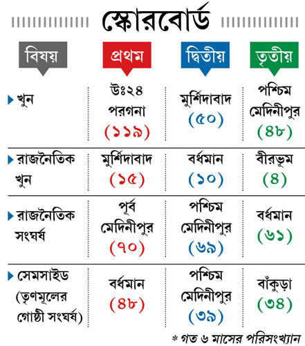 আইন-শৃঙ্খলার নিরিখে পশ্চিমবঙ্গ অন্য রাজ্যকে টেক্কা দিচ্ছে কি না, সে বিচার আপাতত মুলতুবি থাক। বর্ধমানে আজ, বুধবার মুখ্যমন্ত্রী মমতা বন্দ্যোপাধ্যায়ের শততম প্রশাসনিক বৈঠক। তার আগের দিন, অর্থাৎ মঙ্গলবার পর্যন্ত বিভিন্ন জেলা থেকে আসা খুন-খারাপি, রাজনৈতিক হিংসার সরকারি পরিসংখ্যানে চোখ বোলাতে গিয়ে দেখা যাচ্ছে, মুখ্যমন্ত্রীর দাবির সঙ্গে বাস্তবের ফারাক দুস্তর! স্রেফ গত ছ’মাসেই মমতা বন্দ্যাপাধ্যায়ের রাজ্যে খুন হয়ে গিয়েছে ৫৬৯টি। যার মধ্যে ৩৮টি ‘রাজনৈতিক’ খুন, আর ১২টি হয়েছে শাসকদলের গোষ্ঠীদ্বন্দ্বের জেরে।