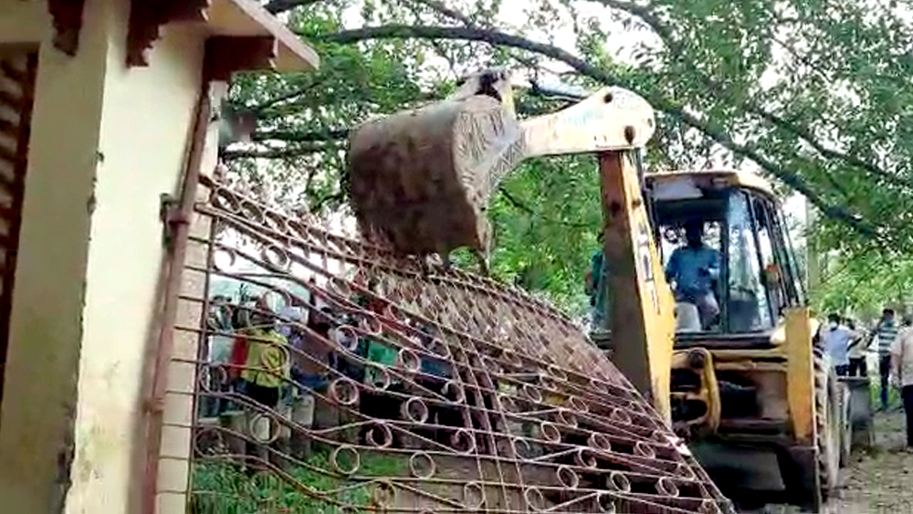 নির্মা্ণের জন্য আনা পে লোডার দিয়ে ভাঙা হয় গেটের স্তম্ভ।