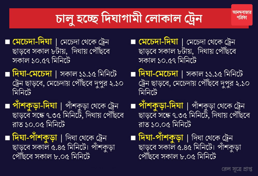 রেল সূত্রের খবর, পুরনো সূচি মেনেই মেচেদা থেকে দিঘার ট্রেন ছাড়বে সকাল ৮টায়। পৌঁছবে সকাল ১০টা ৫৭ মিনিটে। আবার দিঘা থেকে সকাল ১১টা ১৫ মিনিটে ট্রেন ছাড়বে এবং সেটা মেচেদায় পৌঁছবে দুপুর ২টো ১০ মিনিটে। অন্য দিকে, পাঁশকুড়া থেকে দিঘাগামী ট্রেন ছাড়বে সন্ধে ৭টা ৩৫ মিনিটে। দিঘায় ট্রেনটি পৌঁছবে রাত ১০ টা ৫ মিনিটে। আবার, দিঘা থেকে পাঁশকুড়াগামী লোকাল ট্রেন ছাড়বে সকাল ৫টা ৪৫ মিনিটে। পৌঁছবে ৮টা ৫ মিনিটে।