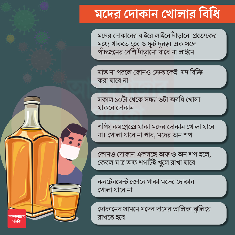 কেন্দ্রীয় সরকার মদের দোকান খোলার ব্যাপারে সবুজ সঙ্কেত দেওয়ার পর থেকেই এ রাজ্যেও শুরু হয়ে যায় জল্পনা। কেন্দ্রীয় সরকারের নির্দেশিকা অনুসারে কনটেনমেন্ট এলাকা ছাড়া সব জায়গায় খোলা যাবে মদের দোকান। এর পর রাজ্যেও খুলতে চলেছে মদের দোকান— এমন গুঞ্জন শুরু হয় প্রশাসনেরও বিভিন্ন স্তরে। শনিবার বিকালেই সোশ্যাল মিডিয়ায় ভাইরাল হয়ে যায় একটি তালিকা। যেখানে রয়েছে কলকাতার ২২টি মদের দোকানের নাম। যেগুলো সোমবার থেকে খোলা হবে বলে উল্লেখ ছিল ভাইরাল হওয়া ওই মেসেজে। যদিও আবগারি কর্তাদের দাবি, এখনও রাজ্য সরকার কোনও বিজ্ঞপ্তি জারি করেনি। তবে তাঁরা স্বীকার করেন কলকাতার কনটেনমেন্ট জোন বাদ দিয়ে ১৪টি মদের দোকানের তালিকা তাঁরা তৈরি করেছেন। যদি বিজ্ঞপ্তি জারি হয়,তাই সেই দোকানের মালিকদের বলা হয়েছে দোকান খোলার জন্য তৈরি থাকতে। পরে তৈরি হয় ২২টি দোকানের তালিকা।
