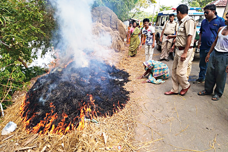 গোলমালের সময় আগুন ধরিয়ে দেওয়া হয়েছে রাস্তার পাশে খড়ের গাদায়। নিজস্ব চিত্র
