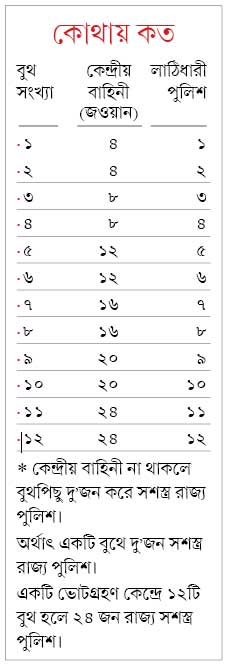 কমিশন রাজ্য পুলিশকে এ-ও জানিয়েছে, প্রতি পর্বেই সমস্ত ভোটগ্রহণ কেন্দ্রে কেন্দ্রীয় বাহিনী রাখার ব্যবস্থা করতে হবে। যদিও কমিশনের এক কর্তা জানান, লোকসভা ভোটে প্রতি বুথে কেন্দ্রীয় বাহিনী দেওয়া সম্ভব নয়। সারা দেশে ভোট হচ্ছে। সেই জন্য এত বাহিনী পাওয়া মুশকিল। তবে এ রাজ্যের প্রতিটি ভোটগ্রহণ কেন্দ্রে যদি কেন্দ্রীয় বাহিনী রাখা যায়, তাতে অন্তত ৮০ শতাংশ বুথে কেন্দ্রীয় বাহিনী থাকবে। এ ছাড়া স্পর্শকাতর বা অতি স্পর্শকাতর বুথে আবশ্যিক ভাবে কেন্দ্রীয় বাহিনী দেওয়া হবে।