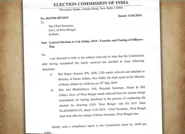 কমিশন নির্দেশ দিয়েছে, স্বরাষ্ট্র সচিব অত্রি ভট্টাচার্যের জায়গায় তাঁর কাজকর্ম দেখভাল করবেন রাজ্যের মুখ্যসচিব মলয় দে। অন্য দিকে বর্তমানে এডিজি সিআইডি পদে থাকা কলকাতার প্রাক্তন পুলিশ কমিশনার রাজীব কুমারকেও অপসারিত করে দিয়েছে নির্বাচন কমিশন। একই সঙ্গে কমিশনের নির্দেশ, কাল শুক্রবার সকাল দশটার মধ্যে কেন্দ্রীয় স্বরাষ্ট্র মন্ত্রকে রিপোর্ট করতে হবে রাজীব কুমারকে। দু’জনকে সরানোর বিষয়ে মুখ্যসচিব মলয় দে-কে চিঠি পাঠিয়ে জানিয়ে দিয়েছে কমিশন। মুখ্যসচিবকে বুধবার রাত দশটার মধ্যে রিপোর্ট পাঠানোর নির্দেশও দিয়েছে কমিশন।