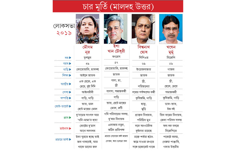 কী রকম? কংগ্রেসের ঈশা আর তৃণমূলের মৌসম, দুই প্রার্থী পারিবারিক সম্পর্কে মামাতো-পিসতুতো ভাই-বোন। ঈশা তিন বছর আগে বিধানসভা ভোটে তাঁর লেবুচাচাকে (আবু নাসেম খান চৌধুরী) হারিয়ে এসেছিলেন। এ বার আরও বড় পরিসরে স্বজনের বিরুদ্ধে আয়ুধ হাতে নেওয়ার পালা! যে পালার দিকে ইঙ্গিত করে খগেন বলতে পারছেন, ‘‘ওদের কাউকে যদি ভোট দেন, তা হলে হয় পিসি-ভাইপোর পরিবার নয়তো কোতুয়ালির (প্রয়াত বরকত গনিখানের বাড়ি) পরিবার ক্ষমতা পাবে। এই পরিবারতন্ত্রের বিরুদ্ধে এক বার রায় দিন!’’