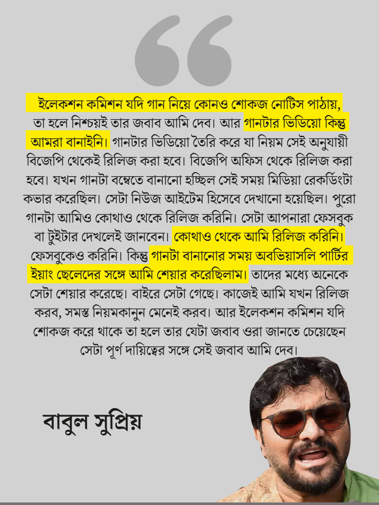 শো-কজ় প্রসঙ্গে বাবুল বলেন, ‘‘কমিশন যদি গান নিয়ে কোনও শো-কজ পাঠায়, নিশ্চয়ই তার জবাব আমি দেব।’’ অন্য দিকে, মুখ্যমন্ত্রীর বিরুদ্ধে অবমাননাকর মন্তব্য করার অভিযোগ প্রসঙ্গে তাঁর বক্তব্য, ‘‘গানের কথা ও লাইনগুলি বিরোধীদের বলা অভিযোগ। নিশ্চয় অকাট্য সত্য, তাই ওঁদের গায়ে লাগছে।’’ জানা গিয়েছে, এই গানের গীতিকার অমিত রায় ও বাবুল নিজে। নিয়মানুসারে, এ ধরনের ক্ষেত্রে ‘মিডিয়া সার্টিফিকেশন এবং মনিটরিং কমিটি’র (এমসিএমসি) কাছ থেকে অনুমোদন নিতে হয়। কিন্তু গানটির ব্যাপারে কমিশনের কাছ থেকে বিজেপি বা বাবুলের তরফে অনুমোদন নেওয়া হয়নি বলে জানিয়েছে কমিশন। রাজ্যের অতিরিক্ত মুখ্য নির্বাচনী আধিকারিক (সিইও) সঞ্জয় বসু জানান, তাঁরা ‘মিডিয়া ওয়াচ’ থেকে এ বিষয়টি নজর করেছেন। সে প্রেক্ষিতে বাবুলের জবাব চাওয়া হয়েছে। ওই গানের বিষয়বস্তু (কনটেন্ট) নিয়ে তৃণমূলের তরফেও আইনজীবী সঞ্জয় বসু অভিযোগ দায়ের করেছেন।