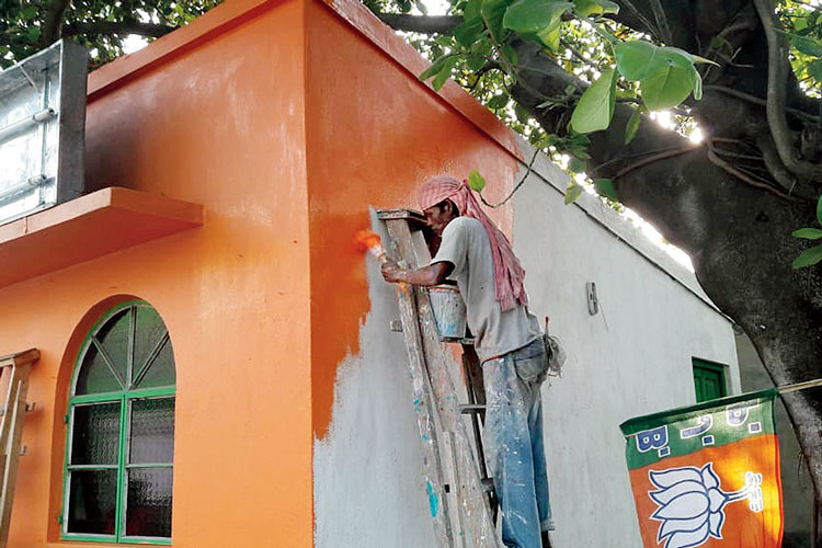 ভোলবদল: অর্জুন সিংহ বিজেপিতে যোগ দেওয়ার পরে শ্যামনগরে তৃণমূলের দলীয় দফতরের ভবন সাজছে কমলায়। —নিজস্ব চিত্র।