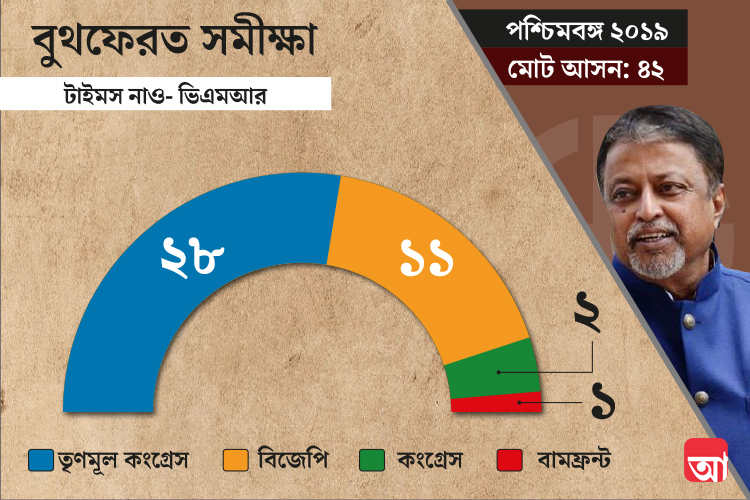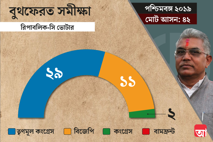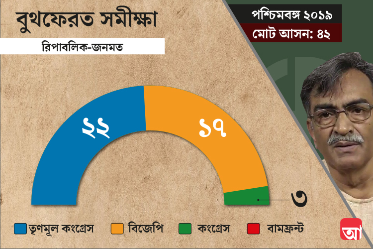 রবিবার শেষ পর্বের ভোট মেটার পরেই বিভিন্ন সংস্থার বুথ-ফেরত সমীক্ষার ফলাফল সামনে আসে। তার সব কটিতেই দেখা যায় তৃণমূল তার গতবারের ৩৪ টি আসন ধরে রাখতে পারছে না। এবিপি আনন্দ-নিয়েলসেন-এর সমীক্ষা অনুযায়ী, তৃণমূল পেতে পারে ২৪টি আসন। বিজেপি ১৬ টি। কংগ্রেস গতবারের চারটি আসন থেকে কমে দুটি আসন পেতে পারে। তবে বামকে এই সমীক্ষা একটি আসনও দেয়নি।