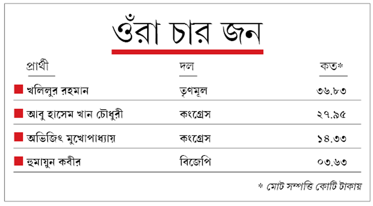 রাজনৈতিক মহলের খবর, তালিকার শীর্ষে থাকা খলিলুর, আবু হাসেম ও অভিজিৎ তিন জনেই সম্পন্ন পরিবার থেকে এসেছেন। খলিলুর মুর্শিদাবাদের ধনী বিড়ি ব্যবসায়ীদের অন্যতম। আবু হাসেম ওরফে ডালু মালদহের চৌধুরী পরিবারের সন্তান ও প্রাক্তন কেন্দ্রীয় মন্ত্রী গনি খান চৌধুরীর ভাই। ব্যবসায়ী ডালুবাবু দীর্ঘদিন বিদেশেও ছিলেন। আর প্রাক্তন রাষ্ট্রপতি প্রণব মুখোপাধ্যায়ের ছেলে অভিজিৎবাবু বিভিন্ন রাষ্ট্রায়ত্ত সংস্থার শীর্ষ পদে চাকরি করেছেন।