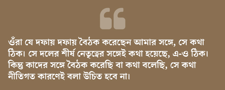 গত সপ্তাহে বৈশাখী বন্দ্যোপাধ্যায়ের সঙ্গে দফায় দফায় বৈঠক করেছেন বিজেপির শীর্ষ নেতৃত্বের প্রতিনিধিরা। একটি বৈঠকে সঙ্ঘের প্রতিনিধিও ছিলেন। বিজেপি, সঙ্ঘ বা শোভন-বৈশাখী— কেউই ওই বৈঠকগুলি নিয়ে প্রকাশ্যে মন্তব্য করছিলেন না। কিন্তু বুধবার বৈশাখী বন্দ্যোপাধ্যায় বললেন, ‘‘ওঁরা যে দফায় দফায় বৈঠক করেছেন আমার সঙ্গে, সে কথা ঠিক। সে দলের শীর্ষ নেতৃত্বের সঙ্গেই কথা হয়েছে, এ-ও ঠিক। কিন্তু কাদের সঙ্গে বৈঠক করেছি বা কথা বলেছি, সে কথা নীতিগত কারণেই বলা উচিত হবে না।’’