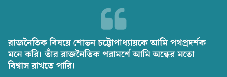 তৃণমূলে শোভনের শিকড় যতটা গভীর, বৈশাখীর তো ততটা নয়। তৃণমূল শীর্ষ নেতৃত্বের সক্রিয়তায় শোভন থেমে যেতেই পারেন। কিন্তু বৈশাখী কেন থামলেন? সেটা কি শোভনেরই পরামর্শে? বৈশাখীর মন্তব্যেই এর উত্তর রয়েছে। তাঁর কথায়, ‘‘রাজনৈতিক বিষয়ে শোভন চট্টোপাধ্যায়কে আমি পথপ্রদর্শক মনে করি। তাঁর রাজনৈতিক পরামর্শে আমি অন্ধের মতো বিশ্বাস রাখতে পারি।’’ অর্থাৎ এই মুহূর্তে গেরুয়া শিবিরে নাম না লেখানোর ‘যৌথ সিদ্ধান্ত’ যে শোভনের পরামর্শ-প্রেরিত, তা নিয়ে সংশয়ের অবকাশ খুব একটা নেই।