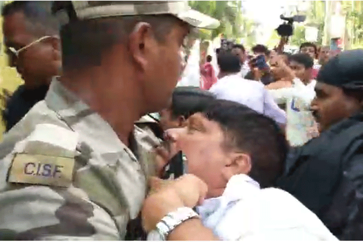 ব্যারাকপুরে পুলিশের সঙ্গে ধস্তাধস্তিতে জড়িয়ে পড়েন অর্জুন সিংহ। তাঁকে বাঁচানোর চেষ্টা করছেন আধা সামরিক বাহিনীর এক জওয়ান।
