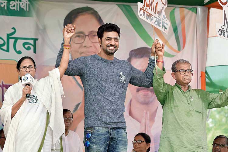 ডেবরার জনসভায় মমতা বন্দ্যোপাধ্যায়ের সঙ্গে দুই প্রার্থী দীপক অধিকারী (দেব) এবং মানস ভুঁইয়া। বুধবার। ছবি: সৌমেশ্বর মণ্ডল
