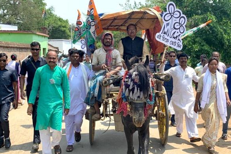 বাঁকুড়ার গ্রামে ঘোড়ার গাড়িতে চড়ে প্রচারে সুব্রত মুখোপাধ্যায়। —নিজস্ব চিত্র