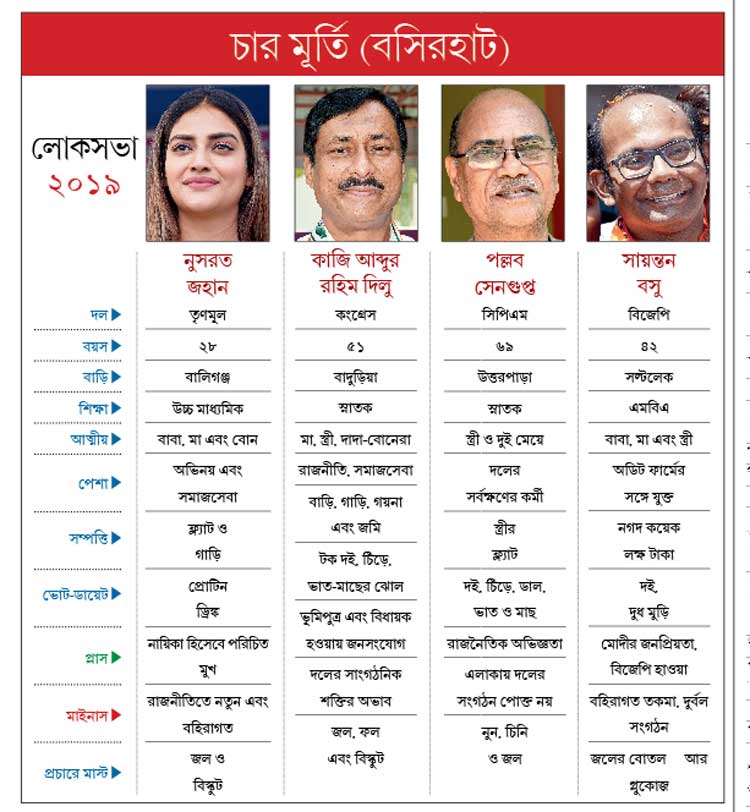 বাংলাদেশ সীমান্ত লাগোয়া উত্তর ২৪ পরগনার বসিরহাট লোকসভা কেন্দ্রের বিস্তার ভয়াবহ। রাজারহাট-নিউটাউনের গা ধরে পৌঁছে যায় সুন্দরবনে। জল-জঙ্গলের সন্দেশখালি আর হিঙ্গলগঞ্জের একটা অংশ বাদ দিলে, বাকি বসিরহাটে ‘অবিশ্বাসের’ বাতাবরণ। ফলে বসিরহাট উত্তরের এক মেরুর আশঙ্কা একই কম্পনে প্রতিফলিত হয় বাদুড়িয়ায় অন্য মেরুর গলায়। তারা বিজেপি চায়।