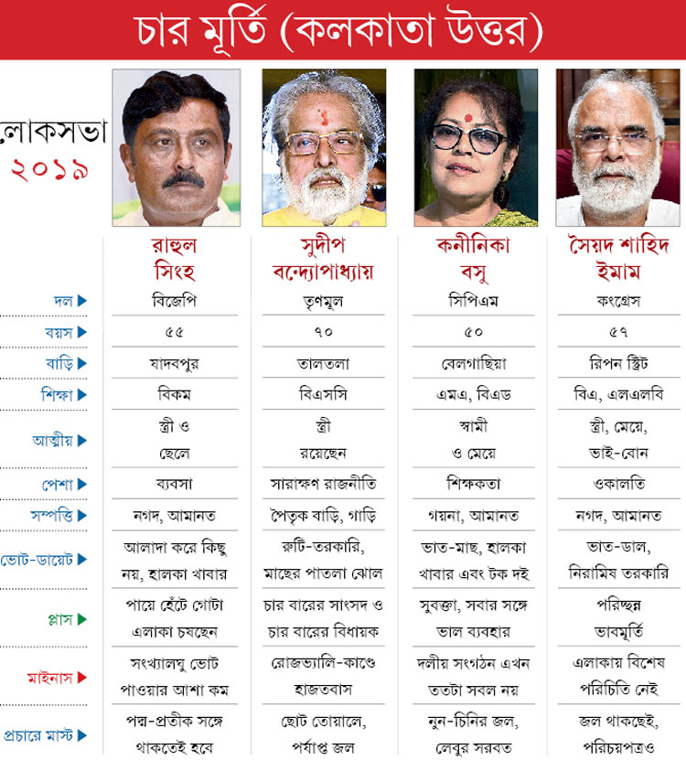উত্তর কলকাতার প্রতি ইঞ্চি সাত-সাত জন বিধায়ক আর পঞ্চাশ কাউন্সিলরের ‘দখলে’ রেখেছে তৃণমূল। তা জেনেই সকাল-সন্ধ্যে এক ফুট চওড়া ছোট গলিপথের ঝুপড়ি ঘরও বাদ দিচ্ছেন না ঘামে ভেজা গেরুয়া উত্তরীয়। পাঁচ বছর আগে পদ্ম প্রতীকে নিজেকে অনেকটাই চিনিয়েছিলেন। তবে পারেননি দশ বছরের সাংসদকে ‘প্রাক্তন’ করে দিতে। সেই চেনা প্রতিপক্ষকে এ বার তাঁর সঙ্গেই পাঞ্জা লড়তে হবে, বাড়তি প্রত্যয়ে বারবারই বুঝিয়ে দিচ্ছেন পাঁচ বছর আগে ৯৬ হাজার ২২৬ ভোটে পরাজিত বিজেপির রাহুল সিংহ। গত বার গেরুয়া শিবিরের ভোট বেড়েছিল প্রায় ২১%। এ বার ‘আত্মবিশ্বাস’ তাঁর শরীরী-ভাষায়।