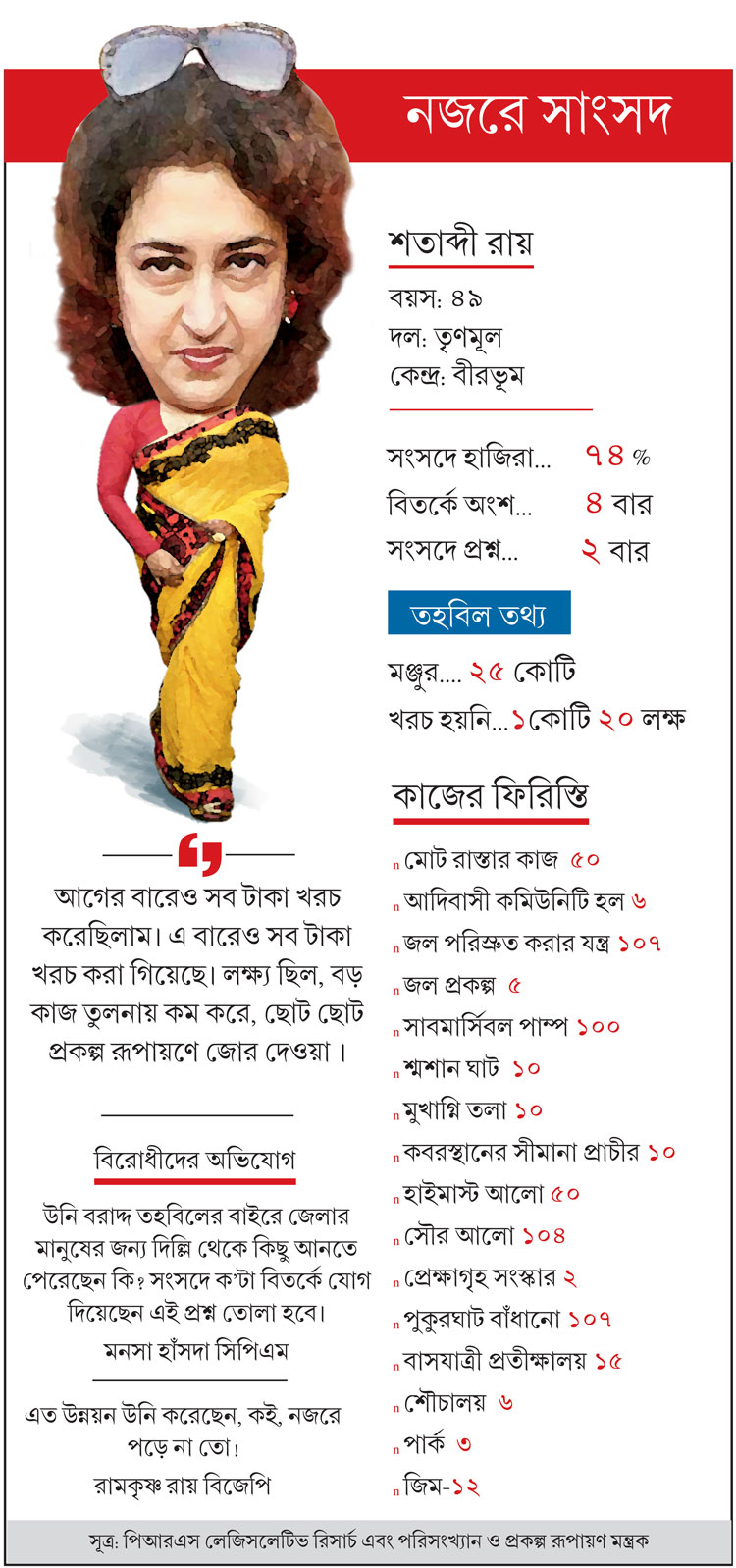 এই পাঁচ বছরে কী কী কাজ হল সাংসদের তহবিল থেকে? কত টাকা মঞ্জুর হয়েছিল? রাস্তা, অ্যাম্বুল্যান্স, স্কুল-কলেজ, নিকাশি, পার্ক, বাজার— কোথায় কত টাকা খরচ হল ওই তহবিল থেকে? সাংসদকে নিয়ে খুঁটিনাটি তথ্যের পাশাপাশি জেনে নিন এ সব জরুরি কথাও।