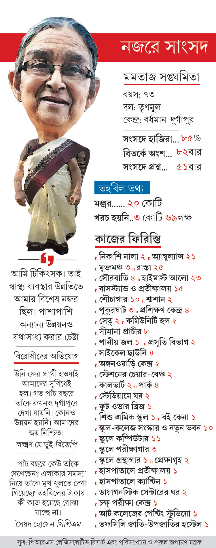 সাংসদ নিজে কী বলছেন? আর বিরোধীরা? সব মিলিয়ে এক নজরে আপনার সাংসদের রিপোর্ট কার্ড। আজ বর্ধমান-দুর্গাপুরের সাংসদ মমতাজ সঙ্ঘমিতা।