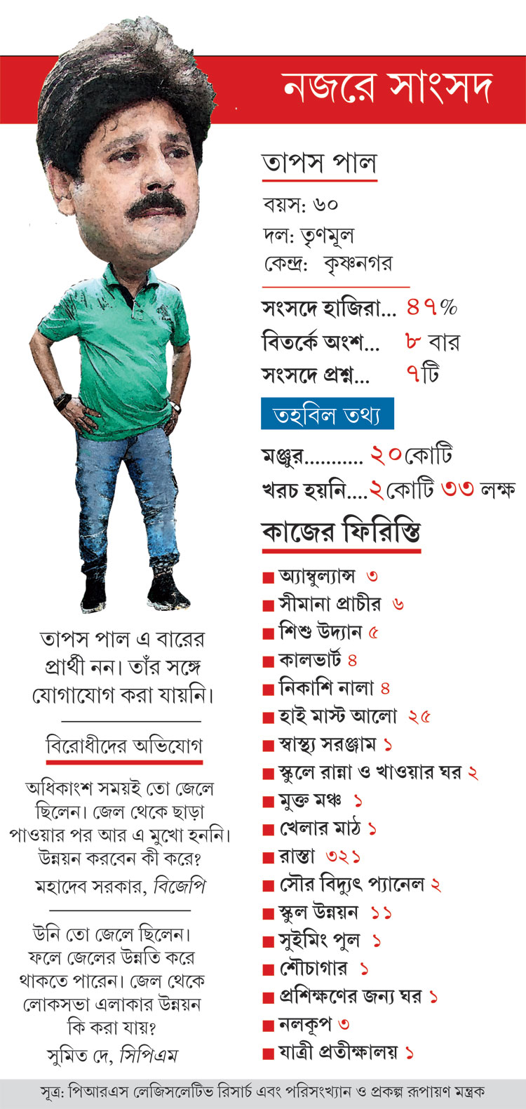 সাংসদ নিজে কী বলছেন? আর বিরোধীরা? সব মিলিয়ে এক নজরে আপনার সাংসদের রিপোর্ট কার্ড। আজ কৃষ্ণনগরের সাংসদ তাপস পাল।
