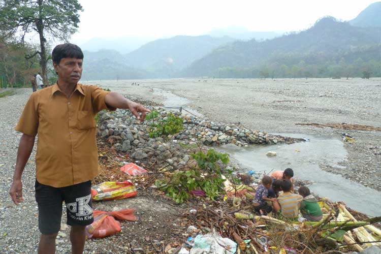 ফি বছর বর্ষায় কী ভাবে বাঁধ ভেঙে গ্রামে ঢুকে যাচ্ছে জয়ন্তী নদী, দেখাচ্ছেন জয়ন্তীর বাসিন্দা শ্যামল বন্দ্যোপাধ্যায়।