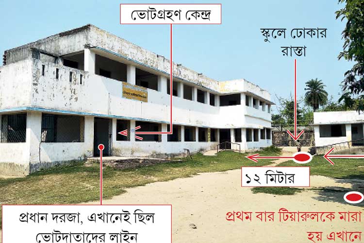 সেই বিতর্ক আরও উস্কে দিয়েছে, কংগ্রেস ও বাম কর্মীদের এক যোগে, রীতিমতো ফিতে নিয়ে এসে মাপজোকের ঘটনা। এ দিন সকালে এক দল কংগ্রেস কর্মী মাপার ফিতে নিয়ে এসে হাজির হন বুথে। চোখে পড়ে, স্থানীয় সিপিএম নেতা-কর্মীদের চেনা মুখও। স্কুলের দেওয়ালে তখনও টিয়ারুলের শুকনো রক্তের দাগ। মাপ নিয়ে দেখা যায়, প্রিসাইডিং অফিসারের টেবিল থেকে সেই দূরত্ব ৩৫ মিটার। ভোটের লাইন যেখানে ছিল তার দূরত্ব বড়জোর ৩৮ মিটার। আর বুথের দরজা থেকে খুনের স্মৃতি নিয়ে পড়ে থাকা সেই রক্তাক্ত দেওয়াল সাকুল্যে ১২ মিটার।