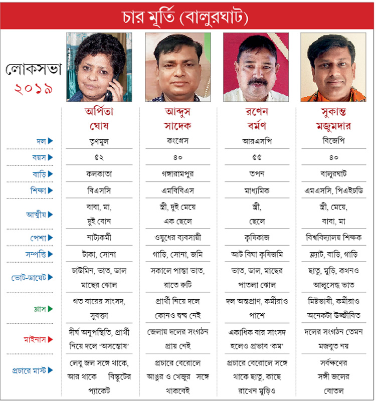 দলের দক্ষিণ দিনাজপুর জেলা সভাপতি বিপ্লব মিত্রের সঙ্গে অর্পিতার ‘মধুর’ সম্পর্কটা, মাস দেড়েক আগেও ছিল বালুরঘাটের চায়ের আড্ডার মুচমুচে বিষয়। দলনেত্রীর কড়া নির্দেশে সে ‘দূরত্ব’ মুছে গিয়েছে বলে বিপ্লব নিজেও দাবি করছেন বটে। তা হলে ম্যাডামের গত বারের লিড (১.৭ লক্ষ) ফিরে আসছে তো? গঙ্গারামপুরে তাঁর অফিস ঘরে বসে বিশেষ ভাঙছেন না বিপ্লব, ‘‘দেখুন না!’’