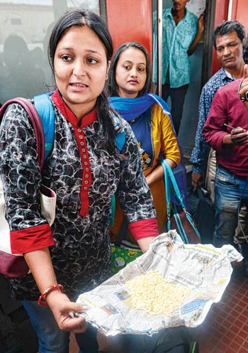 খাবার-বিভ্রাট: নষ্ট খাবার দিয়েছে রাজধানী। মুড়ি খেয়ে রাত্রিযাপন। মঙ্গলবার শিয়ালদহে নেমে ক্ষোভ যাত্রীদের।— নিজস্ব চিত্র