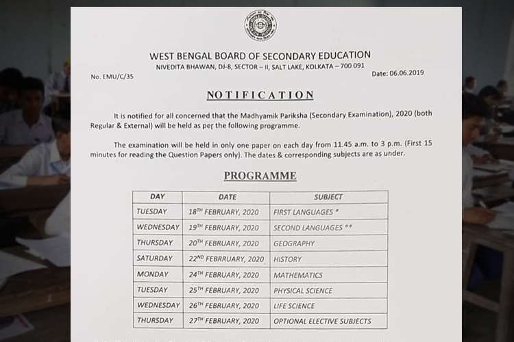 এ বছর মাধ্যমিক পরীক্ষা শুরু হয়ে ছিল ১২ ফেব্রুয়ারি। আগামী বছর মাধ্যমিকে পরীক্ষার সময় কিছুটা পিছিয়ে গেল। প্রতিবছরই ফল ঘোষণার দিন পরের বছরের কবে মাধ্যমিক পরীক্ষা শুরু হবে, তা জানিয়ে দেওয়া হয়। কিন্তু এ বছর ২১ মে মাধ্যমিকের ফল প্রকাশের দিন তা ঘোষণা করা হয়নি। অবশেষে এ দিন জানিয়ে দেওয়া হল মাধ্যমিকের সূচি।