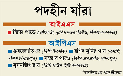 কম্পালসরি ওয়েটিংয়ে যেতে হচ্ছে যে চার আইপিএস’কে, তাঁরা হলেন— কলকাতা পুলিশের ডিসি (ইএসডি) ধ্রুবজ্যোতি দে, ডিসি (এসএসডি) সন্তোষ পাণ্ডে, ডিসি (সাউথ-ইস্ট) সুমনজিৎ রায় ও দক্ষিণ দিনাজপুরের পুলিশ সুপার রশিদ মুনির খান। আর কম্পালসরি ওয়েটিংয়ে পাঠানো এক মাত্র আইএএস অফিসারটি হলেন স্মিতা পাণ্ডে, যাঁকে কিনা নির্বাচন কমিশন কলকাতায় ভোটের আগে দক্ষিণ কলকাতার ‘ডিস্ট্রিক্ট ইলেকটোরাল অফিসার’ (ডিইও) হিসেবে নিয়োগ করেছিল। আইপিএস মহলের একাংশের অভিযোগ, যে সব এলাকায় শাসকদল ভোটে তুলনায় খারাপ ফল করেছে, সেখানকার দায়িত্বপ্রাপ্ত অফিসারদের বিরুদ্ধেই ব্যবস্থা নেওয়া হল। ‘‘ওঁরা রাজনীতির শিকার।’’— মন্তব্য একাধিক আইপিএসের। আইএএস স্মিতার ক্ষেত্রেও শাসক দল একই মনোভাব নিয়েছে বলে অভিযোগ।