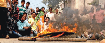 গ্রেফতারের প্রতিবাদে অবরোধ সিউড়ির রাস্তায়। ছবি: তাপস বন্দ্যোপাধ্যায়।
