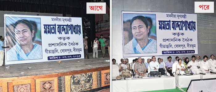 আনন্দবাজারে ছবি প্রকাশিত হওয়ার পরে রাতারাতি বদলে গেল মুখ্যমন্ত্রীর প্রশাসনিক বৈঠকের ভুল বানানের ব্যাকড্রপ । —নিজস্ব চিত্র।