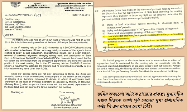 তিনি আরও জানাচ্ছেন, মুর্শিদাবাদ আর আজিমগঞ্জের সংযোগকারী একটি সেতু তৈরি হয়ে গিয়েছে। কিন্তু অ্যাপ্রোচ রোড তৈরির জমিটুকু মিলছে না। ফলে কয়েক কোটি টাকা খরচ করে তৈরি হওয়া সেতুটি কাজে লাগছে না। একই ভাবে তারকেশ্বর-বিষ্ণুপুর ৮২ কিলোমিটার রেল লাইনে কাজ প্রায় শেষ। কিন্তু মাঝের ১৫ কিলোমিটার লাইনের জমি রাজ্য রেলের হাতে তুলে দিতে পারেনি। ওই অবস্থাতেই কাজ বন্ধ হয়ে পড়ে রয়েছে। নলহাটির কাছে ব্রাহ্মণী নদীর উপর একটি সেতু নির্মাণের কাজ কিছু লোকের তোলাবাজি আর হামলার জন্য শুরুই করা যাচ্ছে না। মাত্র এক ছটাক জমির অভাবে ডানকুনি ফ্রেট করিডরের কাজও শুরু করা যায়নি বলে জানিয়েছেন ওই রেল কর্তা।
