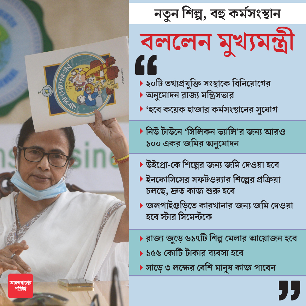 মঙ্গলবার রাজ্য মন্ত্রিসভার বৈঠকের পর নবান্নে সাংবাদিক সম্মেলনে মুখ্যমন্ত্রী জানিয়েছেন, ‘‘কর্মসংস্থানের জন্য আজ ২০টি তথ্য প্রযুক্তি সংস্থাকে অনুমতি দেওয়া হয়েছে। এর ফলে কয়েক হাজার ছেলেমেয়ের কর্মসংস্থান হবে।’’