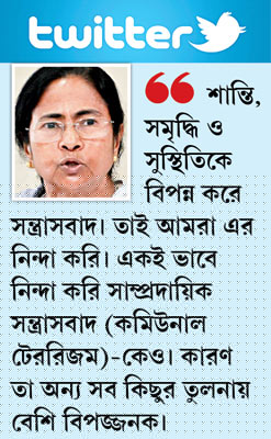 এক টুইট বার্তায় মুখ্যমন্ত্রী এ দিন বলেন, ‘‘শান্তি, সমৃদ্ধি ও সুস্থিতিকে বিপন্ন করে সন্ত্রাসবাদ। তাই আমরা এর নিন্দা করি। একই ভাবে নিন্দা করি সাম্প্রদায়িক সন্ত্রাসবাদকেও (কমিউনাল টেররিজম)। কারণ তা অন্য সব কিছুর তুলনায় বেশি বিপজ্জনক।’’