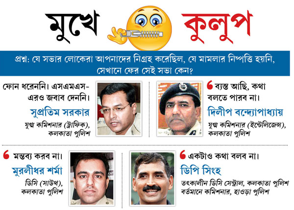 প্রত্যাশিত ভাবেই সে দিনের আক্রান্ত পুলিশ-কর্তারা এখন পুলিশমন্ত্রীর সিদ্ধান্ত নিয়ে মুখ খুলতে নারাজ। তাঁরা পারতপক্ষে এই প্রসঙ্গ এড়িয়েই যাচ্ছেন। কলকাতা পুলিশের যুগ্ম কমিশনার (ট্রাফিক) সুপ্রতিম সরকার যেমন ফোন ধরেননি, মেসেজেরও জবাব দেননি। আর যুগ্ম কমিশনার দিলীপ বন্দ্যোপাধ্যায় ‘ব্যস্ত’ আছেন বলে কথা বলতে চাননি। ডিসি (সাউথ) মুরলীধর শর্মা বা তৎকালীন ডিসি (সেন্ট্রাল), অধুনা হাওড়ার পুলিশ কমিশনার ডি পি সিংহ মন্তব্য করতেই চাননি।
