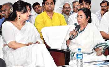 পাশাপাশি। বাঁকুড়ার প্রশাসনিক বৈঠকে সাংসদ মুনমুন সেন ও মুখ্যমন্ত্রী মমতা বন্দ্যোপাধ্যায়। ছবি: অভিজিৎ সিংহ।