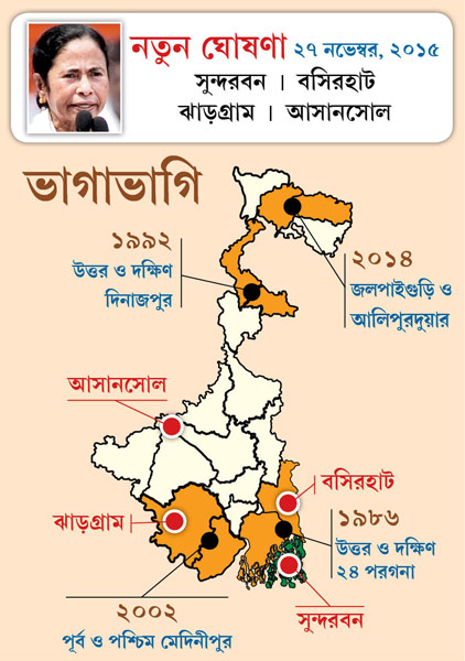 মুখ্যমন্ত্রীর ঘোষণা মোতাবেক, সুন্দরবনের মতো উত্তর ২৪ পরগনার বসিরহাটও আলাদা জেলার মর্যাদা পাবে। বর্ধমান জেলা ভাগ হবে দু’ভাগে— শিল্প ও গ্রামীণ। নবান্ন সূত্রের খবর, আসানসোল-রানিগঞ্জের মতো শিল্পাঞ্চল নিয়ে গড়ে উঠবে বর্ধমান শিল্প-জেলা। বাকি কৃষিপ্রধান এলাকা থাকবে বর্ধমান গ্রামীণের আওতায়। পশ্চিম মেদিনীপুরের ঝাড়গ্রাম এই মুহূর্তে স্বতন্ত্র পুলিশ জেলা হিসেবে রয়েছে। এ বার তাকেই পূর্ণাঙ্গ জেলার চেহারা দিতে চায় রাজ্য।