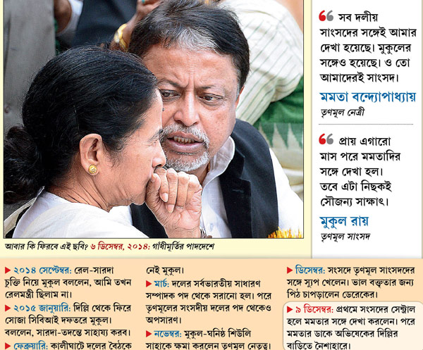 সারদা কেলেঙ্কারিতে সিবিআইয়ের ডাক পাওয়ার পরে গত ১১ মাস ধরে মুকুলের সঙ্গে কোনও যোগাযোগ ছিল না মমতার। সিবিআই সূত্রের দাবি ছিল, সারদার কাছ থেকে কী ভাবে সুবিধা নিয়েছেন তৃণমূল নেত্রী, তার খতিয়ান দিয়েছেন মুকুল। তার পরেই দলের অঘোষিত দু’নম্বরকে ধীরে ধীরে ছেঁটে ফেলেন তৃণমূল নেত্রী। দলের সর্বভারতীয় সম্পাদক পদ থেকে শুরু করে যাবতীয় দায়িত্ব কেড়ে নিছক সাধারণ সাংসদ করে রাখেন মুকুলকে।