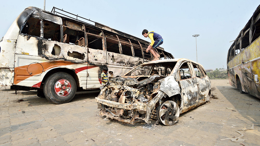 শনিবার সাঁতরাগাছিতে বিক্ষোভের আগুনে পুড়েছে গাড়ি। রবিবার সেখানেই খেলা খুদেদের। ছবি: দীপঙ্কর মজুমদার