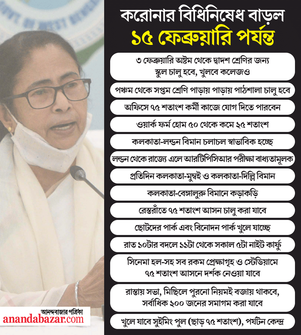 বিভিন্ন ক্ষেত্রে ছাড়-সহ রাজ্যে বিধিনিষেধ চালু থাকবে আগামী ১ ফেব্রুয়ারি থেকে ১৫ ফেব্রুয়ারি পর্যন্ত। নৈশ কারফিউ-এর সময় কিছুটা কমানো হল। রাত ১০টা থেকে ভোর ৫টার বদলে এখন থেকে রাত ১১টা থেকে ভোর ৫টা পর্যন্ত জারি থাকবে কারফিউ।