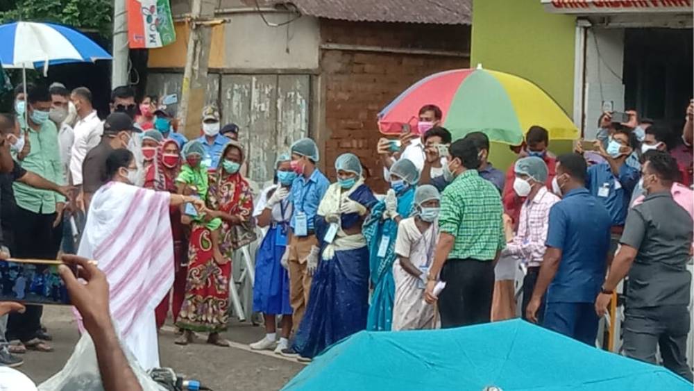 ঘাটালে নেমে অনুকূল ঠাকুরের আশ্রমে যান মমতা। সেখানে গিয়ে মন্দিরের পুরোহিতদের সঙ্গে দেখা করেন তিনি। আশ্রমের বাইরে জড়ো হয়েছিলেন কিছু মানুষ। তাঁদের ত্রাণ দেন মুখ্যমন্ত্রী।