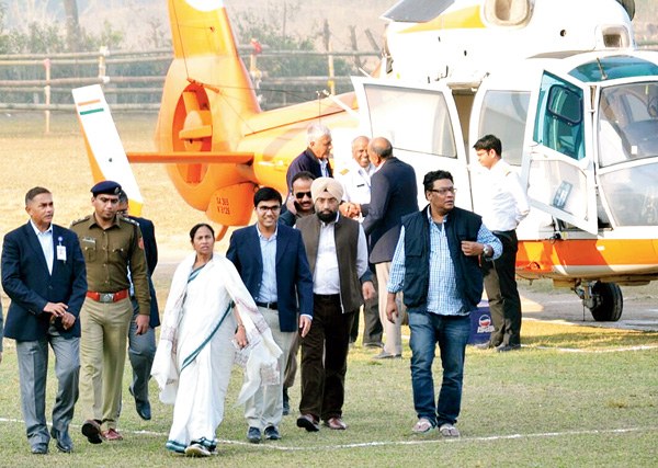 শিলিগুড়ি সুকনায় হেলিকপ্টার থেকে নামছেন মুখ্যমন্ত্রী মমতা বন্দ্যোপাধ্যায়। মঙ্গলবার। নিজস্ব চিত্র।