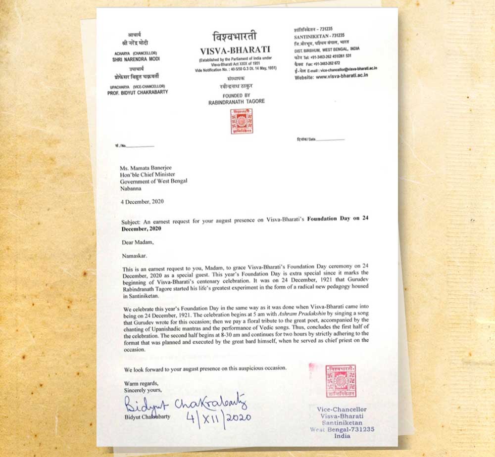 বিশ্বভারতীর প্যাডে লেখা ৪ ডিসেম্বরের একটি চিঠি ইতিমধ্যেই প্রকাশ্যে এসেছে। মুখ্যমন্ত্রী মমতা বন্দ্যোপাধ্যায়কে উদ্দেশ্য করে লেখা এই চিঠি নিয়ে বৃহস্পতিবার সাংবাদিক বৈঠকে ব্রাত্যকে প্রশ্ন করা হলে তিনি পাল্টা প্রশ্ন করেন, ‘‘সেই চিঠির কোনও প্রাপ্তি স্বীকার করা হয়েছিল কি? ওই চিঠির প্রাপ্তি স্বীকারের নথি আছে কি? উপাচার্য নিজেই সই করে নিজের কাছে ওই চিঠি রেখে দিয়েছিলেন নাকি?’’ অনুষ্ঠানের আগের রাতে মুখ্যমন্ত্রীকে আলাদা করে অনুষ্ঠানের কথা জানানো হয়েছিল বলেও কিছু সাংবাদিক দাবি করেন। তার উত্তরে ব্রাত্য বলেন, ‘‘মমতা বন্দ্যোপাধ্যায় একটি রাজ্যের মুখ্যমন্ত্রী। তাঁকে আমন্ত্রণ জানানোর এটা কোনও নিয়ম? এ ভাবে কাউকে আমন্ত্রণ জানানো হয়?’’