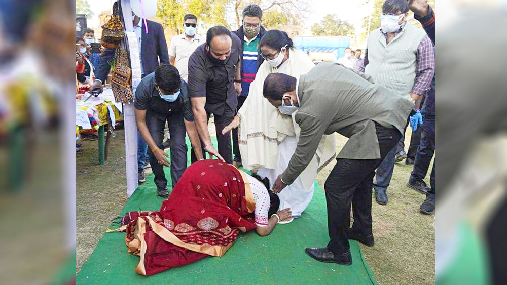 দুয়ারে সরকার শিবিরে মমতা বন্দ্যোপাধ্যায়কে প্রণাম। সোমবার বোলপুরের এই শিবির থেকে মোড়া কেনেন মমতা। —নিজস্ব চিত্র।