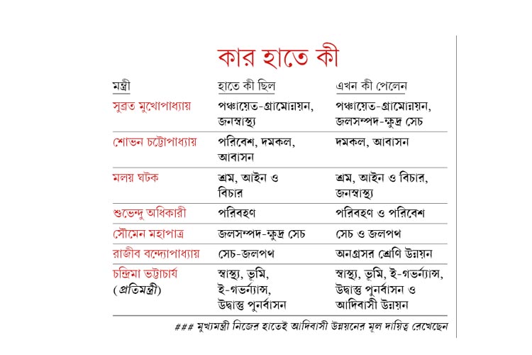 বুধবার সেই তালিকায় যোগ হল আরও কয়েকটি নাম। কারওর গুরুত্ব কমানো হল, আবার কয়েক জনের বাড়ল দায়িত্ব। সেচ দফতরের দায়িত্ব রাজীব বন্দ্যোপাধ্যায়ের হাত থেকে নিয়ে দেওয়া হল সৌমেন দাস মহাপাত্রকে। সেচের বদলে চূড়ামণির অনগ্রসর কল্যাণ দফতরের ভার পেলেন তিনি। কলকাতার মেয়র শোভন চট্টোপাধ্যায়ের পরিবেশ দফতরের ভার লাঘব করে অতিরিক্ত হিসেবে দেওয়া হল পরিবহণ মন্ত্রী শুভেন্দু অধিকারীকে। গুরুত্ব বাড়ল আইন মন্ত্রী মলয় ঘটকেরও। আইন-বিচার-শ্রমের পাশাপাশি এ বার তিনি দেখবেন জনস্বাস্থ্য কারিগরি দফতরও। পঞ্চায়েতের সঙ্গে অতিরিক্ত হিসেবে এই দফতর আগে দেখতেন সুব্রত মুখোপাধ্যায়।